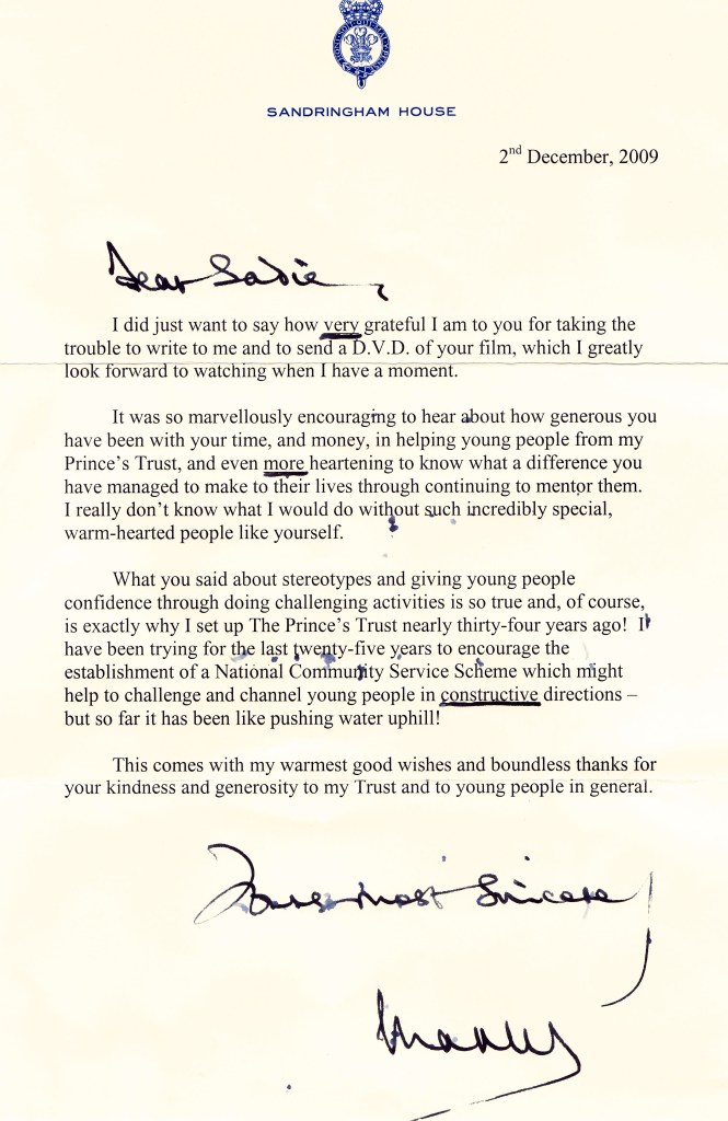 “Dear Sadie, I just want to say how very grateful I am to you… It was marvelously encouraging to learn about how generous you have been with your time and money in helping young people from my Prince’s Trust and even more heartening to know what a difference you have managed to make to their lives through continuing to mentor them… I really don’t know what I would do without such incredibly special, warm hearted people such as yourself… What you said about stereotypes and giving young people confidence through challenging activities is so true… This comes with my warmest good wishes and boundless thanks for your kindness and generosity to my Trust and to young people in general.”